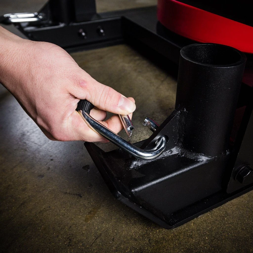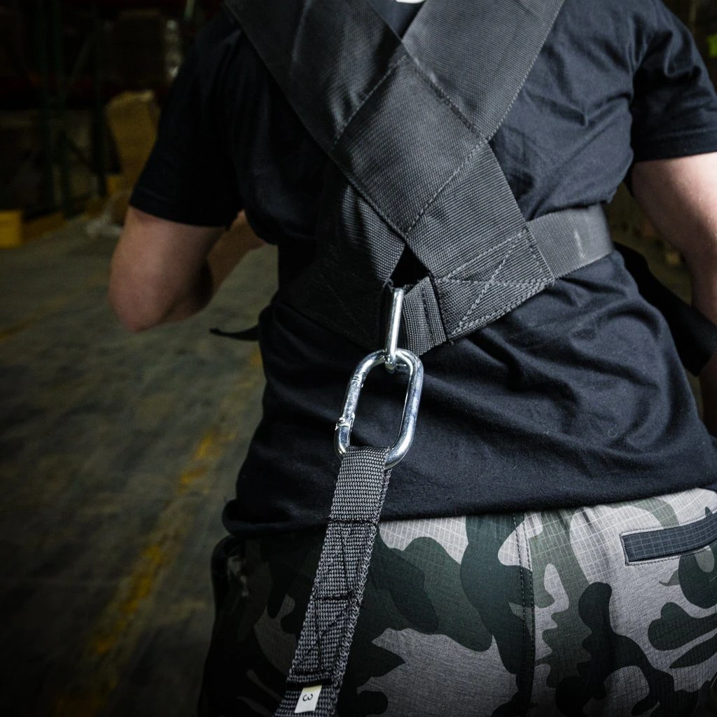The PRx Prowler Sled is sturdy and built to punish. The handles can be moved from the front to the back, and the post can accommodate up to five (5) 45lb rubber plates. Use the handles or the included cross-back harness to move this thing around.
