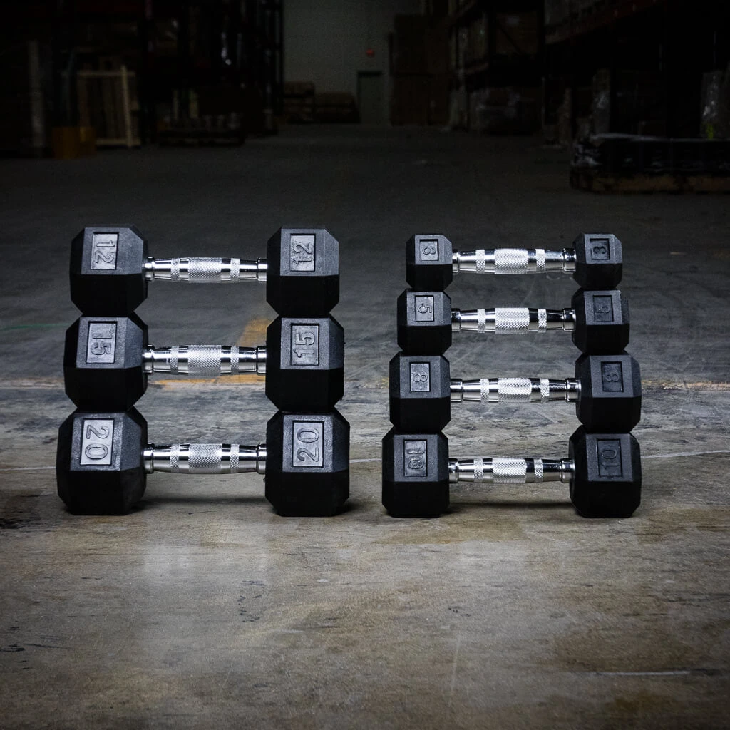 Workout with dumbbells to increase your range of motion and stay injury free while building size and strength. Six-sided and rubber coated, PRx Rubber Hex Dumbbells will have low impact on your floor and won’t roll around once you set them down.